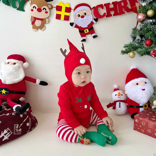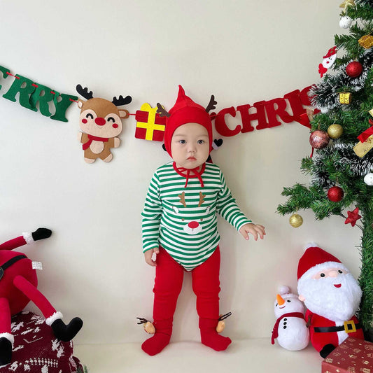 【FCUC20241101005】24新款韓版嬰兒連體衣套裝ins耶誕節主題條紋哈衣包屁衣三件套